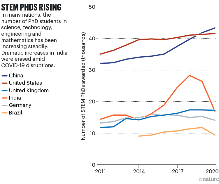 尽管全球范围内难以获取关于学术领域的精确数据,但高等教育研究者一致认为,大学对科学、技术、工程与数学(STEM)学科的重视程度远超以往(见“STEM博士数量增长”图表)。例如,中国多所高校能跻身全球排名前列,主要依托其STEM领域研究实力——该领域既关乎经济利益,也影响高校声誉。